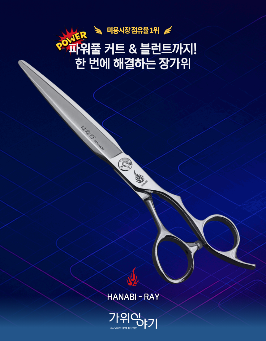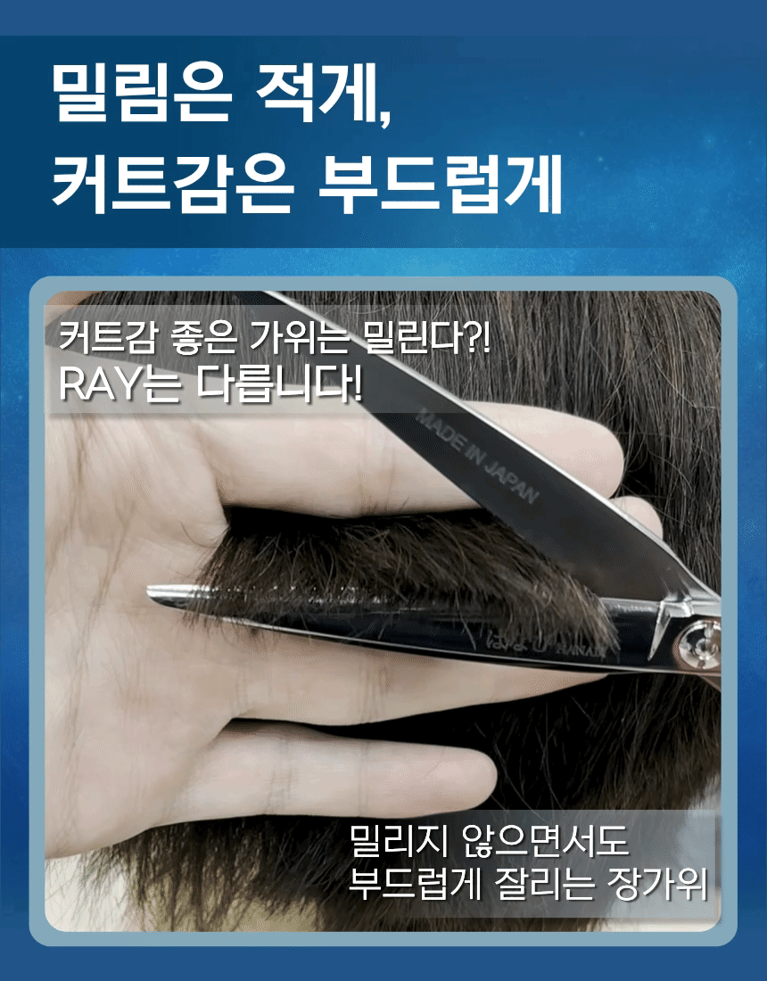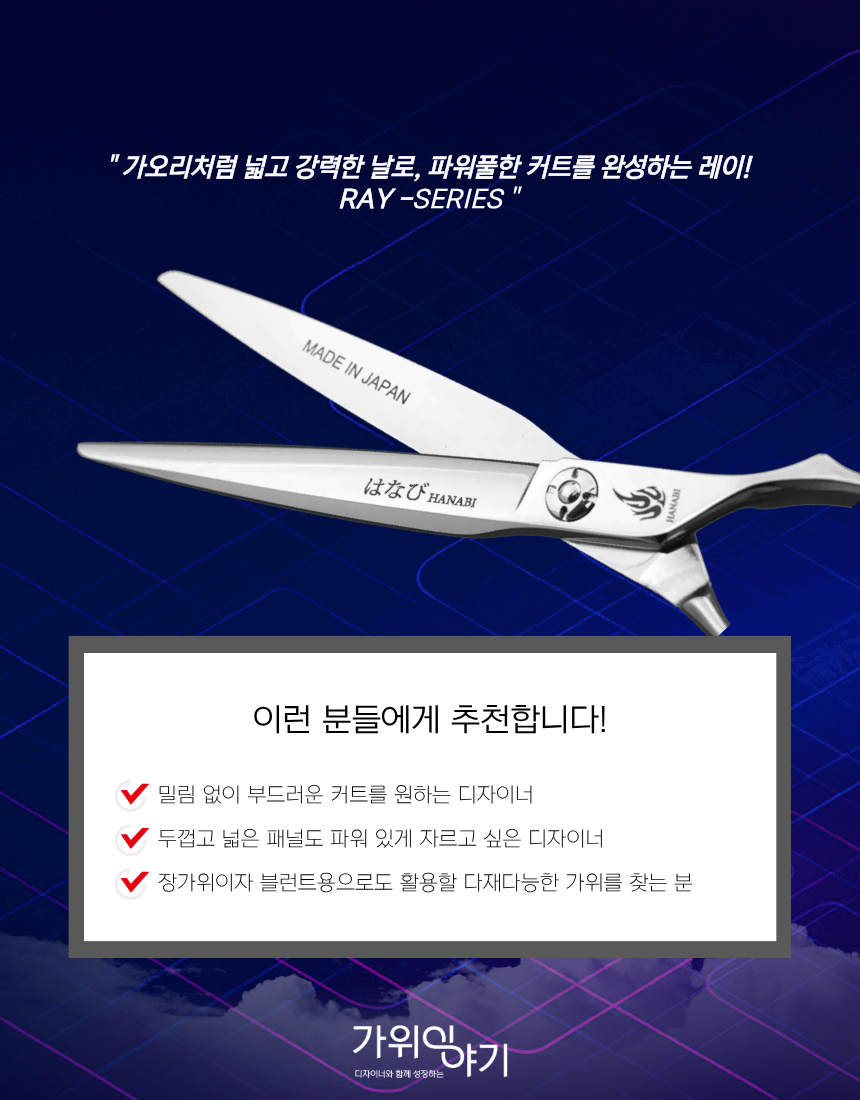 가오리를 닮은 넓고 묵직한 날로 두꺼운 패널도 파워풀하게 잘라버릴 수 있는 장가위입니다. 밀리지 않으면서도 부드러운 커트감이 특징입니다.