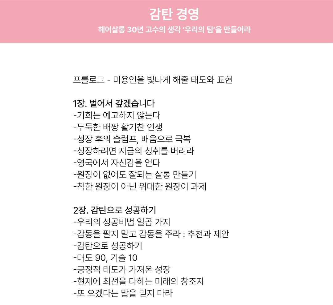 대한민국을 대표하는 헤어트렌드 리더에서 성공한 미용 경영인으로!미용은 기술이 전부가 아닌 사람의 마음을 얻는 것!