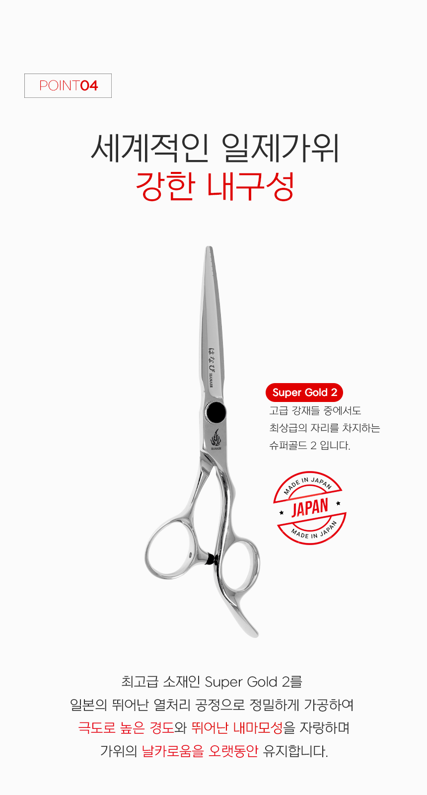 세계 최고의 가위 재질인 슈퍼골드2 제작되어, 처음의 날카로운 절삭력이 무뎌짐 없이 압도적으로 오래 유지됩니다.